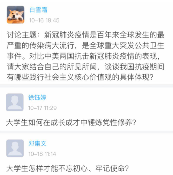 结合所见所闻,谈谈我国抗疫期间有哪些践行社会主义核心价值观的具体体现”“党的十九大对党章的重要修改有哪些内容”“大学生怎样才能不忘初心、牢记使命”“大学生如何在成长成才中锤炼党性修养”等理论学习专题讨论内容,引导学员结合时政运用科学原理分析和研判社会现象,确保理论学习不走过场,真正做到内化于心、外化于行,取得真切学习实效。文图|罗颀
